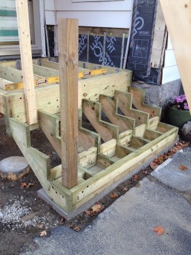 I’ve renovated lots of porches over the past twenty years, and have always found that one of the most time-consuming phases of this type of project is rebuilding the staircase. Finding the rise and run is easy, but framing stairs by installing one piece at a time is slow and labor-intensive. In order to speed up the job and improve accuracy, I’ve recently started building prefabricated stair stringer ‘kits’.