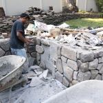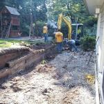 My mason contractor formed and poured a 12-inch-by-24-inch footing along the length of the wall. Ten-inch hollow concrete block was then set on the footing. Rebar was pinned into the footing every few feet and the block cavities containing the rebar were grouted full, per the engineer’s instructions. The next day, the mason plastered and subsequently tarred both sides of the retaining wall prior to backfill. To provide the excavator access to get his machinery back up the grade to complete the backfill process, a section of the wall was only partially blocked up.