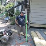 My crew tore out the old deck, then an excavation contractor dug out the area. This was no simple task because the small lot had limited access for moving machinery and dirt in and out. Since there was so little room to work and we’d be replacing a fair amount of the excavated dirt with gravel for drainage, we trucked out the majority of the dirt during the initial excavation.