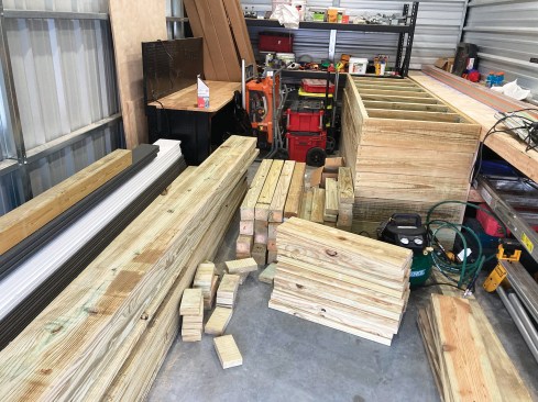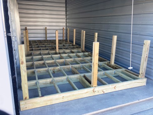 Shown here are the modules needed for two decks, with blocking and railing posts installed.