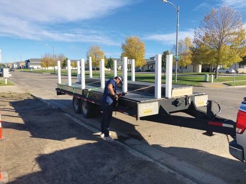 After the decking is attached to the framing with clips, the modules are loaded onto a flatbed trailer for delivery to the site.
