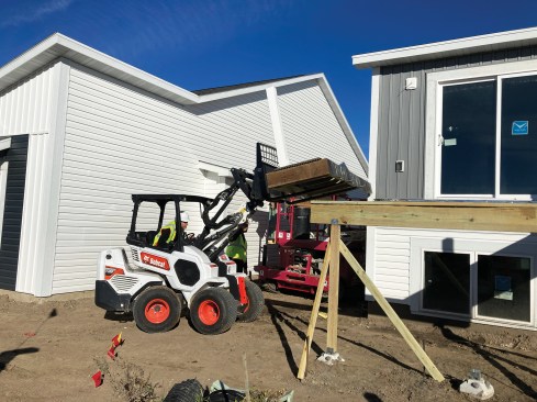 After the ledger is screwed to the house framing, the crew installs Diamond Pier pin-pile footings, support posts, and the preassembled beam and knee braces needed to support the modules. Then they use an articulated loader to lift the modules into position.