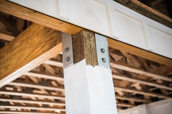 Uplift connectors that tie vertical and horizontal framing members together to resist high winds are required on coastal decks.