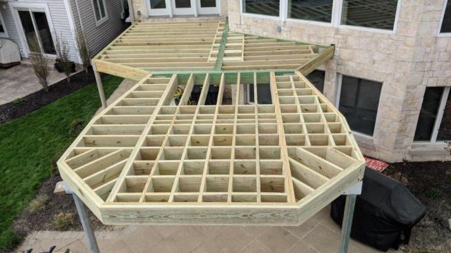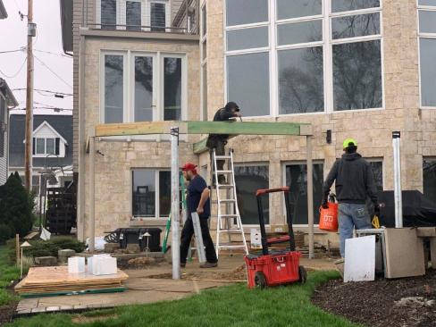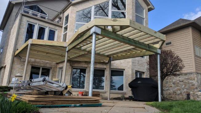 There was an existing elevated deck, and we were able to reuse the three steel columns that had been supporting it, as well as a stainless steel spiral staircase that provided outside access to the deck. After dismantling the old decking and framing apart and carefully setting the staircase aside, we removed enough of the stone pavers from the patio below the deck to dig a pair of holes for two new footings. After digging down below frost line (48 inches in my area), we placed a pair of 24-inch diameter tube forms in the ground and filled them with concrete. After the concrete cured, we anchored 4-inch diameter steel columns to the footings, welded custom-fabricated brackets to the tops of the columns to match the existing supports, and began framing.