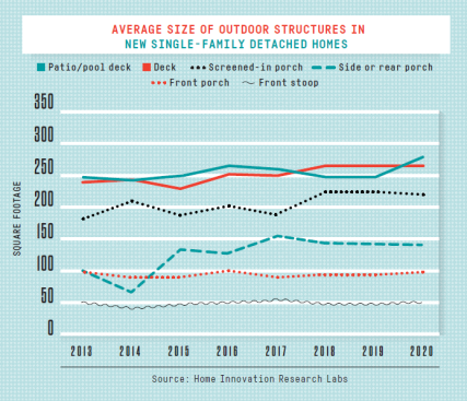 The average size of patios and pool decks in new single-family homes rose from 250 square feet in 2019 to roughly 280 square feet in 2020. The size of new decks has risen slightly to about 260 square feet in 2020, while the size of screened-in porches is down to about 220 square feet, and side or rear porches have seen no change in size.