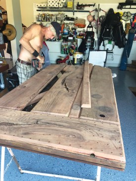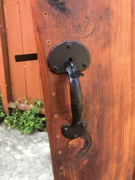 As I glued and screwed the boards to the frame, I snugged them together with bar clamps for a tight fit. After assembly, I gave all sides of the door three coats of PPG ProLuxe (formerly Sikkens) transparent matte finish to bring out the redwood’s beautiful grain and color. To match the door’s rustic look, I sourced hand-forged gate hardware and four giant carriage hinges that were made in England but stocked by a local supplier.