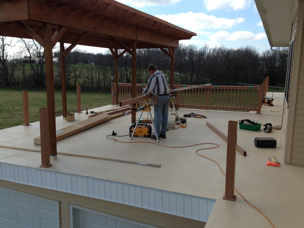 I finished the deck edges with vinyl fascia and soffit underneath to match the rest of the house. A pergola on top provides shade and makes our triple-duty deck a little more comfortable when we have a moment to sit down and enjoy the great view. Inside, I now have a weathertight garage with extra room for yard and garden stuff. As a bonus, the deck provides a means of egress from each back room in the house in case of fire (though not officially listed as such on the plans).