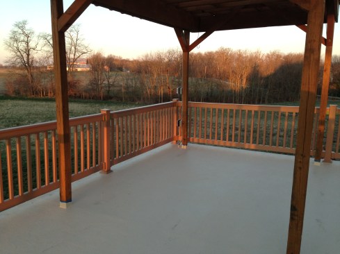 Once the waterproofing layer had cured, I rolled on a couple of coats of Safe-T-Deck top coat, also from Ames. This is a plastic paint with granules that creates a non-skid finish. I used this on the waterproofed deck, as well as on the PT stairs (including treads, risers, and stringers) leading up to the deck.
