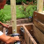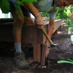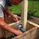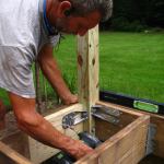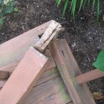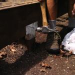 The original 4×4 posts were cast into the concrete footings and showed no signs of decay. But they were notched, so only one ply of the double rim beam was fully supported. To strengthen the load path, we installed short 2×4 support blocks between the top of the footings (which were about an inch below grade) and the outside beam ply. Since most new PT 2x4s—including those that are stocked locally—are only treated for “above-ground” use, we repurposed some of the old CCA-treated 2x4s for the blocks.