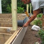 Because the new decking—TimberTech Earthwoods Evolutions Terrain—would be installed with HIDFast stainless fasteners, we installed extra nailing blocks alongside joists where the butt joints would fall so that the fasteners could be held back from the plank ends.