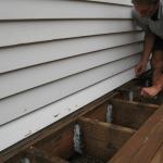 When we pressure-washed the gunk out and carefully checked the condition of the siding and framing, however, we discovered that the siding, skirt board, and rim joist were still in good condition, possibly because the owner pressure-washed the deck every couple of years. Another factor that probably limited damage is the fact that the red cedar and redwood siding and skirt board were protected with a good coat of paint.