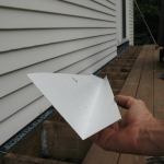 We fabricated aluminum L-flashing with a 5 ½-inch-tall wall leg—the tallest possible without bumping up against the nails on the overlying siding course—and a 3-inch-wide joist leg. Along the edge of the joist leg, we bent a reverse hem to stiffen the metal and make it easier to handle when slipping it into place. With the riser boards out of the way, it was easy to slide the flashing pieces behind the siding and along the ledger. Finally, after the flashing was installed, we renailed the clapboards that we had pried away from the wall.
