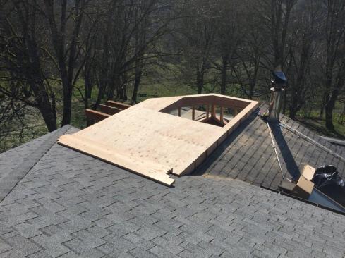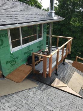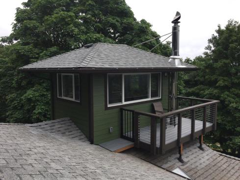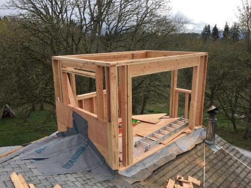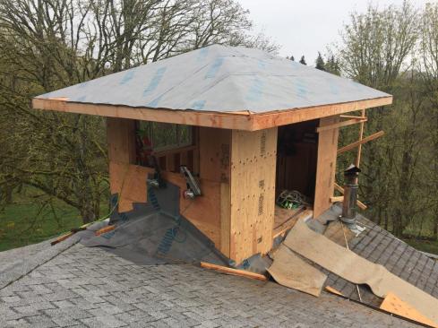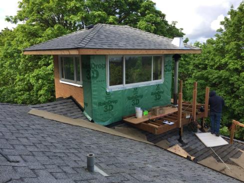 Once the floor system was in place, we framed up the new 2×6 stud walls for the widow’s walk. The new space is capped with a 5-in-12 hip roof.