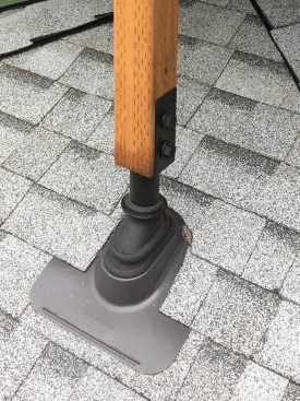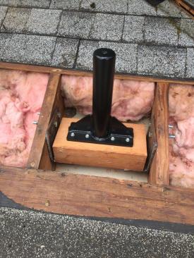 After reinstalling the roof sheathing, workers slipped standard pipe jack flashing boots over the riser bases and patched in the roof shingles. 4×4 PT Doug fir posts were then bolted to the U-shaped saddles that complete the SkyLift riser assembly.