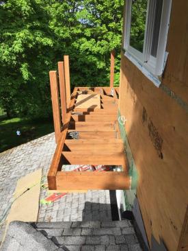 While part of the wrap-around deck is supported by beams bearing on the 4×4 PT Doug fir posts bolted to the SkyLift risers, the deck is also partly supported by the cantilevered beams that were installed as part of the reading room floor system.