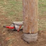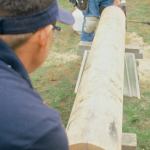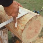 Cutting the slot for the HD-10A requires another layout at the bottom end. Using the chalked layout line and a level, draw a vertical line on the log’s end, then measure down this line to find the center of the log. Next, measure where the HD-10A protrudes in relation to the center of the pedestal and transfer that location to the base of the log, so that the log will be centered.