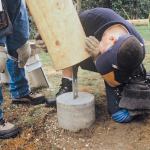 Regardless of the size of the footing where it bears on the ground, the top of the concrete — which I call the pedestal — needs to be 1 inch to 2 inches smaller than the bottom of the log post. This provides a drip edge around the bottom of the log, helping to keep water from running underneath the bottom of the posts. To prevent water from splashing onto the base of the log or wicking up from the ground, I keep the top of the pedestal at least 6 inches above grade.