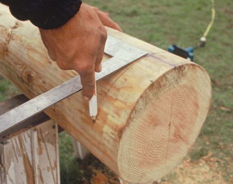 Place the long side of a framing square against the layout line and draw a perpendicular line 2 inches from one end of the log. Some eyeballing will be required. Finally, use a chain saw with a sharp chain to cut the log.