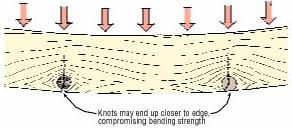 A.You’re right about ripping graded lumber. Doing so “relocates” strength-reducing characteristics that affect performance, and effectively voids the grade designation (see illustration). It’s different with LVL, which is a more consistent material. Manufacturers rip it as standard practice when producing beams. LVL is made in billets up to 48 inches wide that are ripped to commercially available standard depths. It’s okay to rip LVL beams to a smaller depth, too, though you’ll have to recalculate the beam capacity. Sizing software supplied by manufacturers (TJ Beam, for example) provides a sizing override where you can enter a non-standard depth to determine the load-carrying capacity of a ripped LVL.
