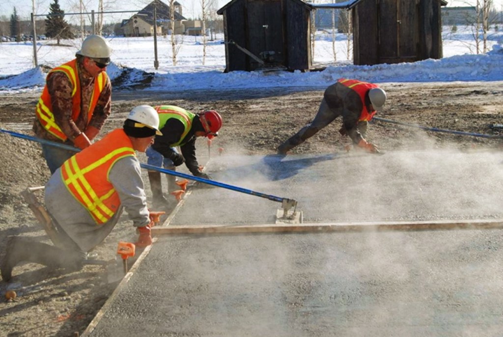 A Fairbanks, Alaska, concrete crew strikes, bull-floats, and trowels freshly placed concrete in a test slab for a demonstration project organized by engineers from the US Army Corps of Engineers Cold Regions Research and Engineering Lab (CRREL). CRREL researchers believe that using concrete mixes formulated with anti-freeze admixtures could extend the season for concrete construction well into the winter months, even in cold regions, without the need to provide heated enclosures or insulation.
