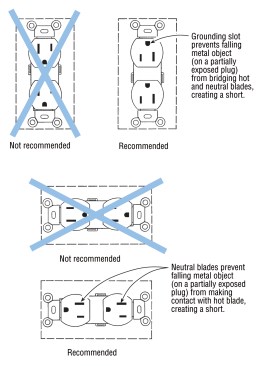 Although it’s not a code requirement, many electricians orient receptacles so that if a metal object (such as a loose metal cover late) falls while something is plugged in, it will land on the plug’s neutral or grounding prong, rather than on the hot one (below).