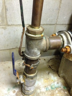 When attaching a bonding wire or electrode conductor to a water pipe, use grounding clamps designed for water pipe attachment. If a water meter is present, two clamps must be used, one on either side of the water meter, with a bonding jumper (ground wire) in between (below).
