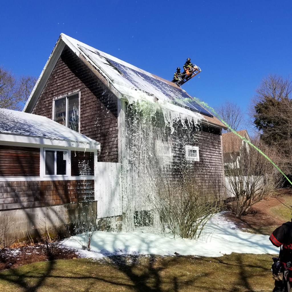 Back outside, the same gentleman came around the side of the building with an IR camera, aiming it at the various spots on the roof and reporting on the temperature readings. With the charred area still steaming and smoking, they made the decision to foam the roof. In any other situation, the scene would have been comical. Thick, green foam covered the entire roof cascading down the wall and onto the grass like some sort of St Patrick’s Day dessert topping. But the foam did the trick, and when the IR camera readings were all down to safe levels, the firefighters rolled up their hoses and were quickly on their way.