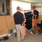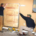 The Powerwall in its plywood shipping crate is jacked up and mounted, then unboxed.