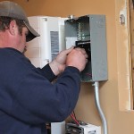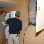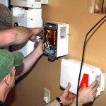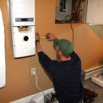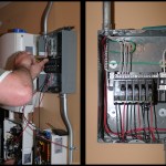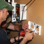 Next, the installers mount a “StorEdge” inverter supplied by SolarEdge, a major manufacturer of inverters for home solar systems. The inverter converts DC to AC power and vice versa, as needed to charge the battery or to draw power from it. The inverter has two modules: one that does the current conversion, and one that handles switching to feed power into the battery or draw power out of it, and to direct AC current to household backed-up loads, main loads, or into the grid. Wired to the inverter is a small transformer serving the backed-up circuits (this component is necessary to provide consistently regulated 120-volt current and grounding). In backup mode, the transformer feeds regulated power through the “load center”—a small breaker box similar to a subpanel, with circuit breakers for the individual backed-up circuits in the home.