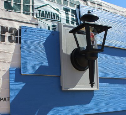3. For all openings: Housewrap should only be slit so the opening can be flashed and the housewrap folded down over the flashing to avoid reverse shingling. For best results, flash all penetrations first, and then install specially designed mounting blocks, such as Tamlyn XtremeBlocks. These molded plastic mounting blocks come in a variety of configurations with built in flanges, flashing and slope to protect against moisture and encourage proper water runoff. While more expensive than wood blocks, the slight additional cost of XtremeBlocks easily offsets the labor required to create a water-sealed, airtight penetration and provide a finished, professional look In addition, the installation of specialty mounting block can be done after mechanicals are installed, which solves trade sequencing problems.
