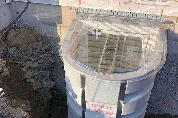Where the soils do not drain particularly well, the hole is over-excavated 2 feet on either side and in front of the prefab well (left) and later backfilled with washed stone and topsoil and sloped away from the foundation (right). The Wellcraft prefab unit comes with a polycarbonate lid, which keeps out the elements and has to maintained by the homeowner (i.e. snow removal).