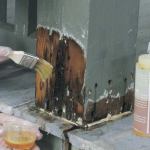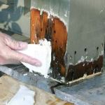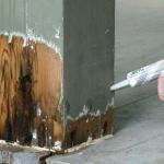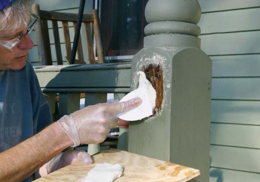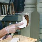 The liquid treatment gradually absorbs into the wood and kills hidden rot, but if I’m repairing a particularly large or heavily damaged structure (such as a column base), I’ll drill a few 1/4-inch holes into the center of the piece and inject a highly concentrated borate gel called Jecta. I purchase all of the borates I use — and some of the epoxies — from Wood Care Systems (800/827-3480, ewoodcare.com), which provides first- rate customer service.