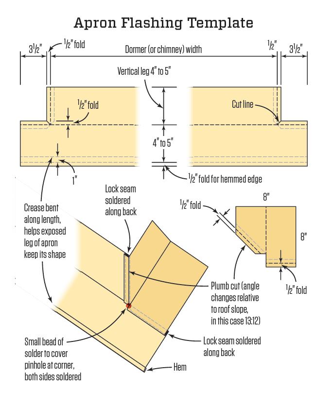My company has done a fair amount of remodeling work on older homes and, over the years, we’ve grown accustomed to working with copper, using it for roof flashings on both remodels and new construction, budget permitting. In addition to copper’s attractive appearance and known durability, we like the ability to solder the seams, which allows us to efficiently prefabricate aprons at dormers and chimneys—we just couldn’t do that with aluminum or galvanized metal. Granted, copper is more expensive and soldering takes time. But we end up with a one-piece, maintenance-free assembly that’s easy to install and, I believe, more watertight than anything we could achieve with other flashing metals.