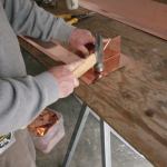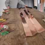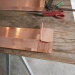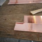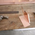Using tin snips and hand brakes (we use Malco‘s), we fabricate the corner pieces. We cut standard 8-by-8-inch copper step-flashing pieces to accommodate two locking seams, cutting an angle for plumb (see illustration, below). Then, we notch out the corners of the apron piece 3 1/2 inches in from the ends, make a 45-degree cut to the inside corner, and fold over two 1/2-inch seams. We leave the folds on the apron and corner pieces slightly open to help join them together.