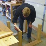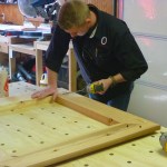 After drilling for pocket screws, the author applies exterior glue to all of the frame joints.