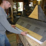 For the curved roof planes, author laid out triangular pieces of sheathing with curved edges.