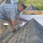 After installing the facia around the perimeter of the cupola roof, author begins the roofing with drip edge along the edge of each side.