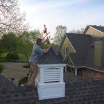 A weathervane tops off the cupola, with its base weather-sealing the peak of the cupola roof.