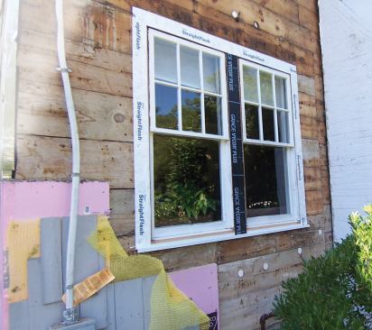 On most of the windows, we flashed the jambs to the sheathing with Grace Vycor Plus, an asphalt-based self-adhering flashing. We also stapled the Vycor to the jambs. While Vycor is fine here, because the adhesive doesn’t contact the foam, it doesn’t seem to be compatible with XPS insulation. Petroleum products don’t mix well with some plastics, and we’ve noticed significant discoloration with some housewraps and rigid foams that have come in contact with Vycor. On the window shown on these pages — the last one on the job — we also used DuPont’s butyl-based StraightFlash, but only because we ran out of Vycor. StraightFlash is about four times more expensive than Vycor, but has better adhesion and is compatible with Tyvek and XPS foam; normally we use it to tape head flashings to the foam.
