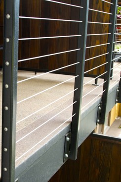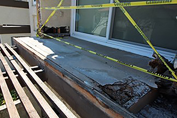 Water intrusion in a waterproofing system is commonly seen often due to a poor railing installation, which causes failure in the deck coating system. Deck mounted railings, which penetrate the waterproof membrane will not only contribute to leaks but will make maintenance more difficult. We recommend installing a face mount railing as seen in the picture.