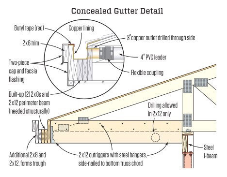 To form the gutter trough, we added another 2×8, followed by two 2x12s, to the perimeter beam. While these framing members were not strictly needed for the structure, they didn’t hurt and they provided an easy means to create a channel that we could line with copper to create an integral gutter around the perimeter. In a few cases, the channel beams were placed high enough on the roof that we could drill drainage outlets in the bottom of the channel. But in most cases, we had to drill through the side. The engineer allowed us to drill through the beam, but we had to limit the hole diameter to 3 inches.