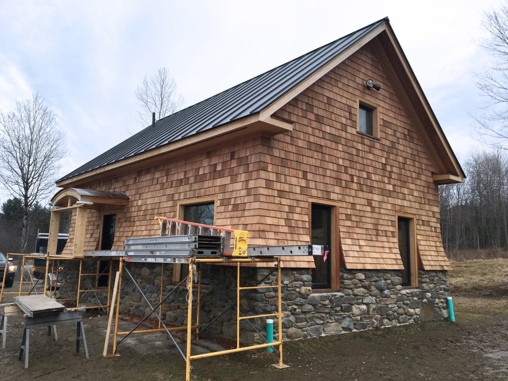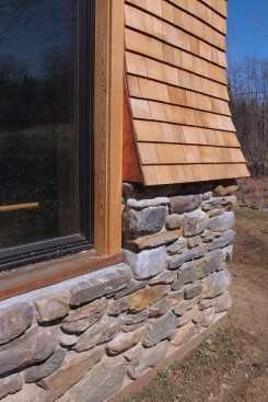 Two years ago, my wife and I broke ground on a 1,100-square-foot Passive House, with an eye toward moving into it when we downsize someday—for now, we plan to rent it out. The exterior is a mix of stone and red-cedar shingles, and to make a durable transition between the two materials, we flared the shingles so they would overhang the stone. This allows water to drip freely away.