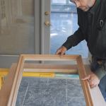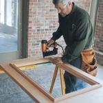 When I fasten the frames to the door, I take care to align the jambs on either side of the door, but only glue and pin one side. Next — since tempered or safety glass is generally required in doors — I remove the temporarily tacked frame and call in the glass company to measure the opening. I schedule the door for finishing while the glass is being fabricated. I want to make sure the door is stained or painted before the glass company comes back to install the glass.