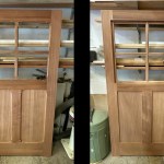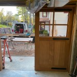 Finishing up. We set the panes of 1/4-inch tempered glass in thin beads of silicone applied to the rear of the “fixed” front muntins. Then we screwed the removable closure muntin frame to the interior side of the door, tooling the silicone to shed water. Later, our painting trade partner finished the door with long-lasting clear sealer, and I installed the finish door hardware.