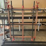With the door assembled, we transferred it from the stand to the workbench, then secured it with pipe clamps on both sides. (Clamping just the top of door leaves the possibility that the joint will open up on the bottom face.) We stood the door off to the side, then started assembling the next one.