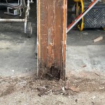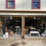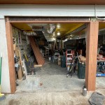Installed on the gable-end wall (left), the doors were hard to operate, both headers were sagged, and the foot-wide support wall separating the two sets of doors was rotted at the bottom. The existing doors were hinged doors and the homeowners wanted them replaced in kind (right).