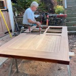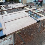 Big doors. In this case, replacing the four garage doors “in kind” presented certain challenges. I decided to build the 48-inch-wide-by-90-inch-high doors from 12/4-thick sapele in my shop with the same tools and techniques I would use on site. Due to the unwieldy size and weight of the doors—each finished door weighed 150 pounds—one of our crew members, Ed Brady, helped build and move the doors around as needed. Also, for ease of construction, I ordered the material from M.L. Condon Co. located in Stormville, N.Y., a few towns away. It dimensioned and thickness-planed the sapele from a cut list I supplied.