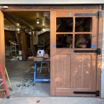 On site. The guest home’s two-bay garage was located in the building’s walkout basement. We removed the old garage doors from the gable-end wall façade and demoed the existing jamb framing down to the block foundation. The existing support wall between the two door openings was badly rotted, so we removed it as well, then reframed the rough openings with pressure-treated 2×6 stock and the center support with a built-up PT 2×6 post. We trimmed out the door openings with 1-inch-thick sapele fastened with 2 1/2-inch exterior screws, which were countersunk and later plugged.