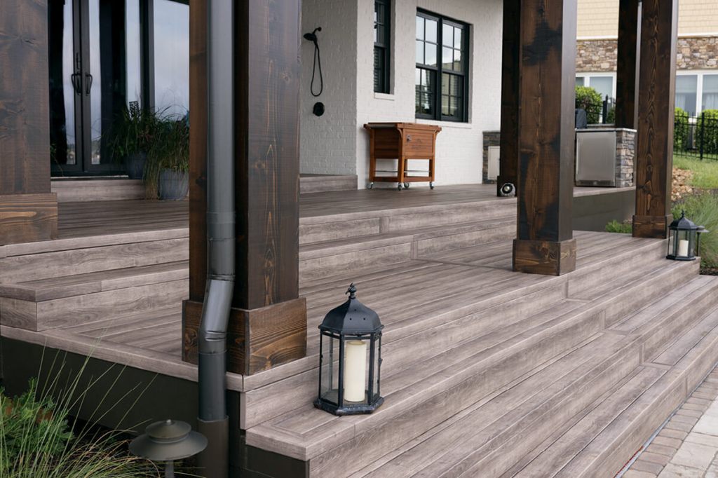 Besides traditional decks, homeowners are incorporating decking into their backyard designs in creative ways. It is being used on the front porch, as siding on contemporary homes, and even as partition walls or lining outdoor showers. Composite decking is an excellent choice for nontraditional decking uses because it is more comfortable than wood and reduces splinters.