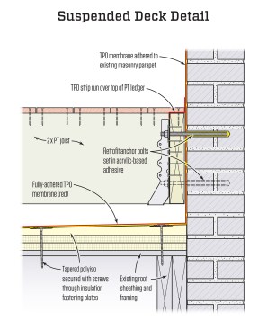 To reduce the chances of water flowing behind the bolted ledgers and penetrating the bolt holes, we flash the tops of the ledgers, typically with a TPO strip sealed to the wall and running over the ledger (see “Suspended Deck Detail,” below). Even though our fastener holes are not large, it seems prudent to try to keep the area behind the ledger dry.